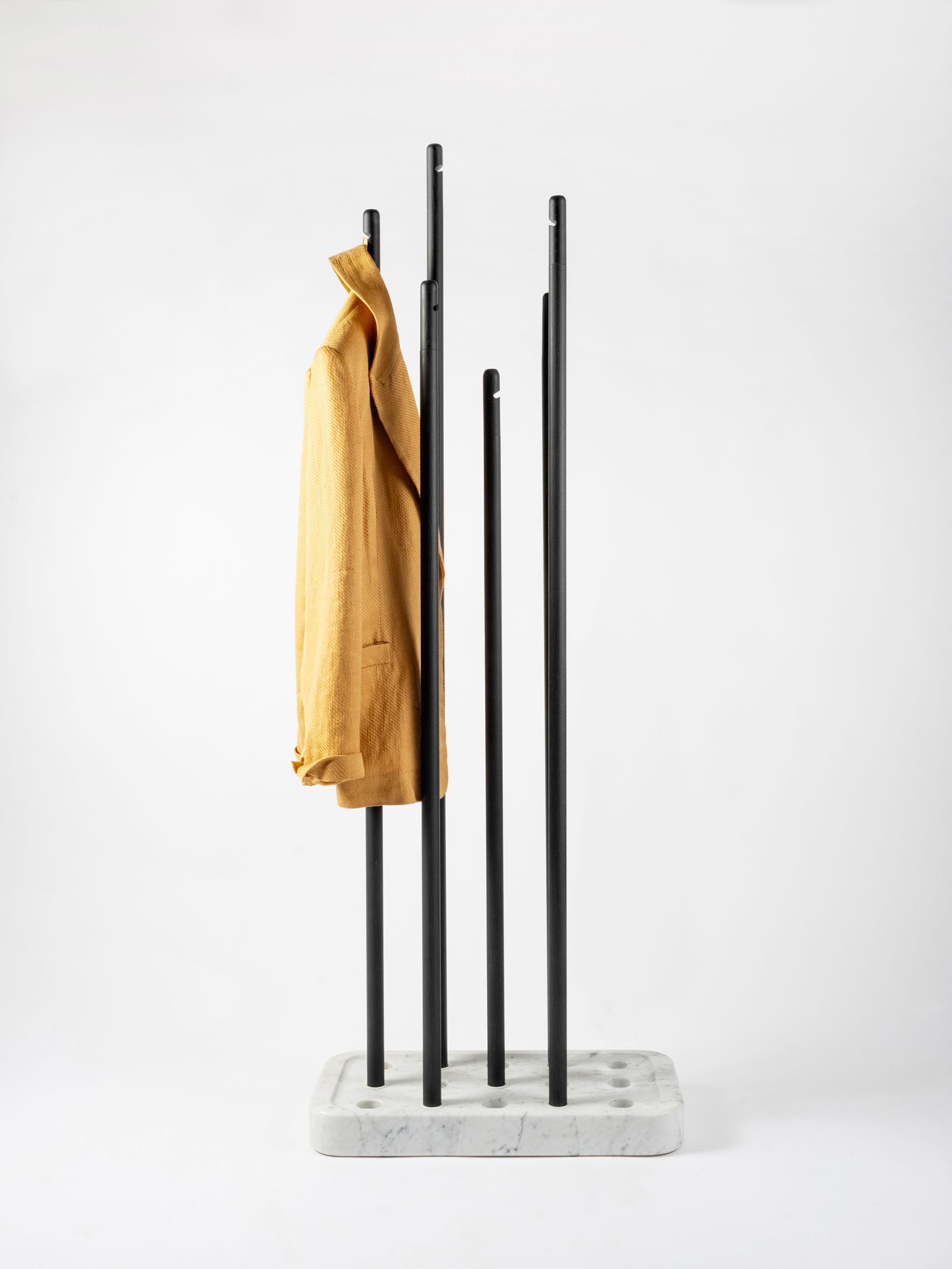Laurel est un porte-manteaux et un support de parapluies constitué de bâtons de bois implantés dans un socle en marbre de Carrare.