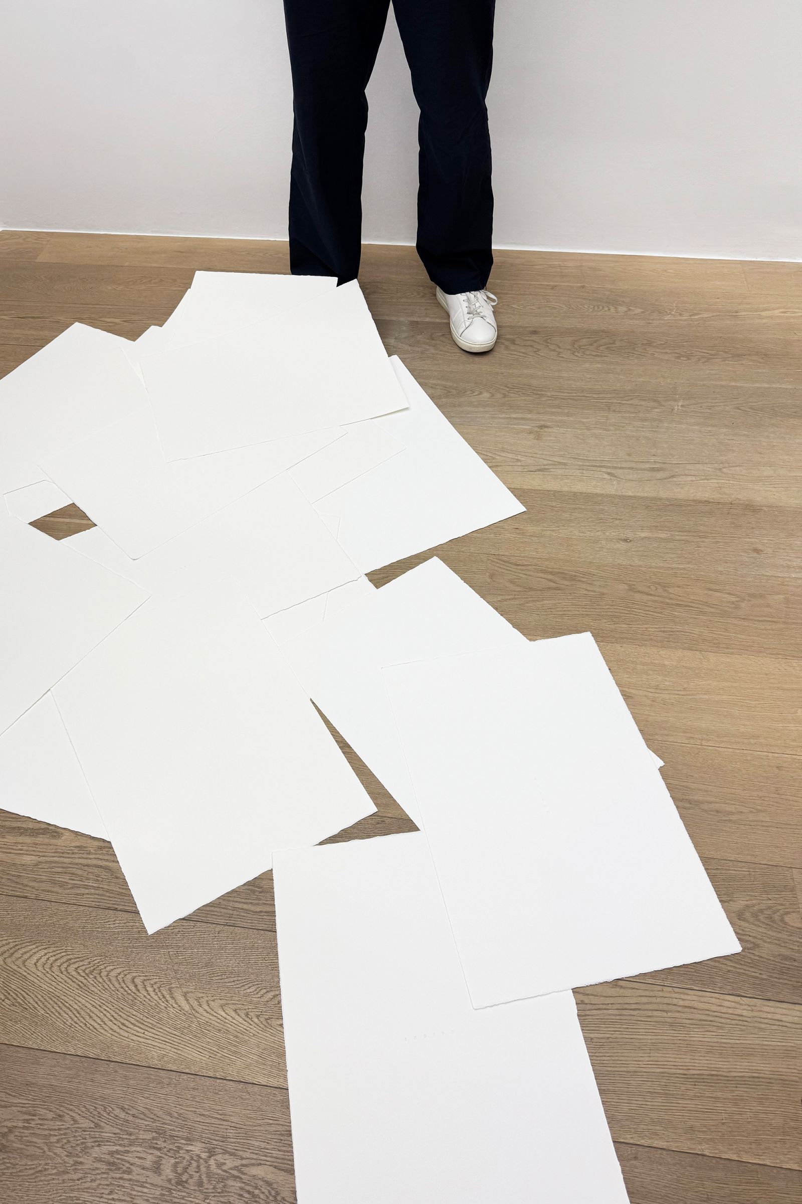 Performance in the form of an “almost silent” reinterpretation of Bob Dylan’s famous video for Subterranean Homesick Blues, filmed by D.A. Pennebaker in London on May 8, 1965. Unlike a sign that would assert a statement, small, barely legible to the audience, words are punched into the thickness of the papers he pours out in a hypnotic slowness. Some words are murmured, others left unspoken. The falling white sheets unfold in calm gestures. A large pile of these discreet and silent words gradually covers the ground.