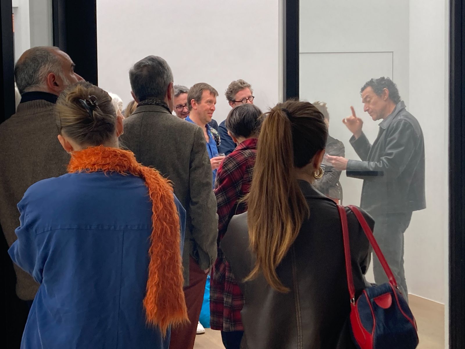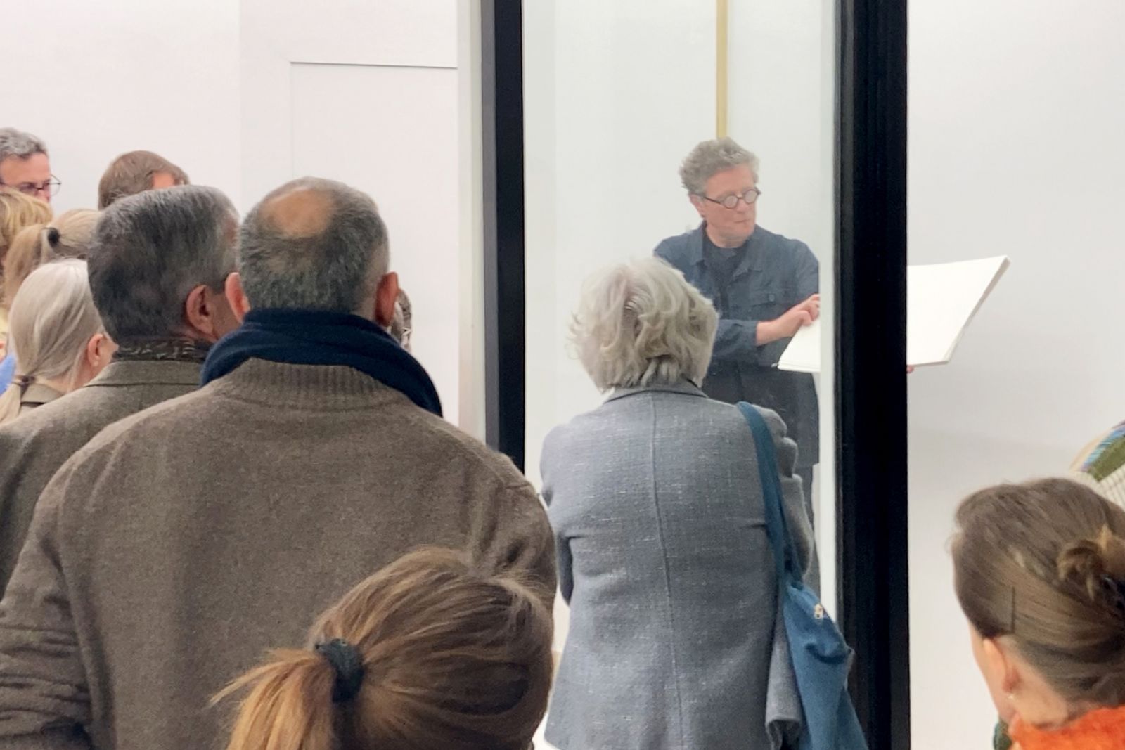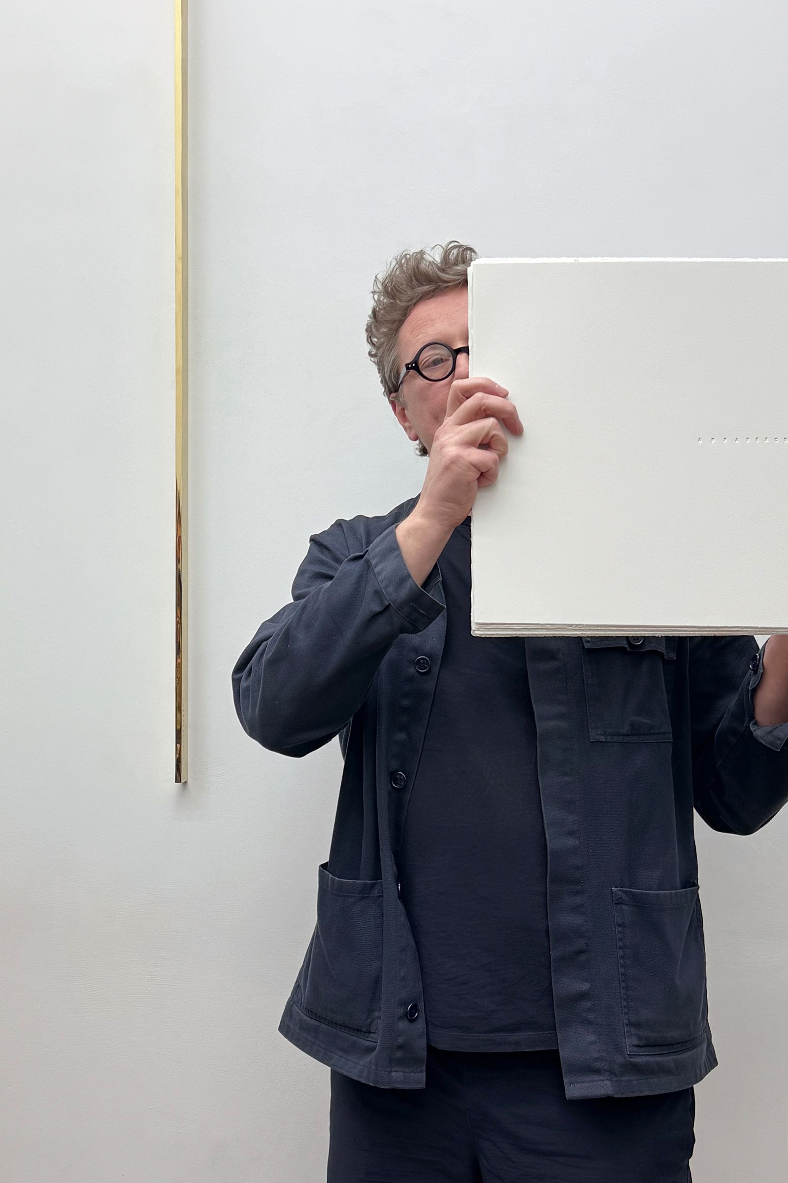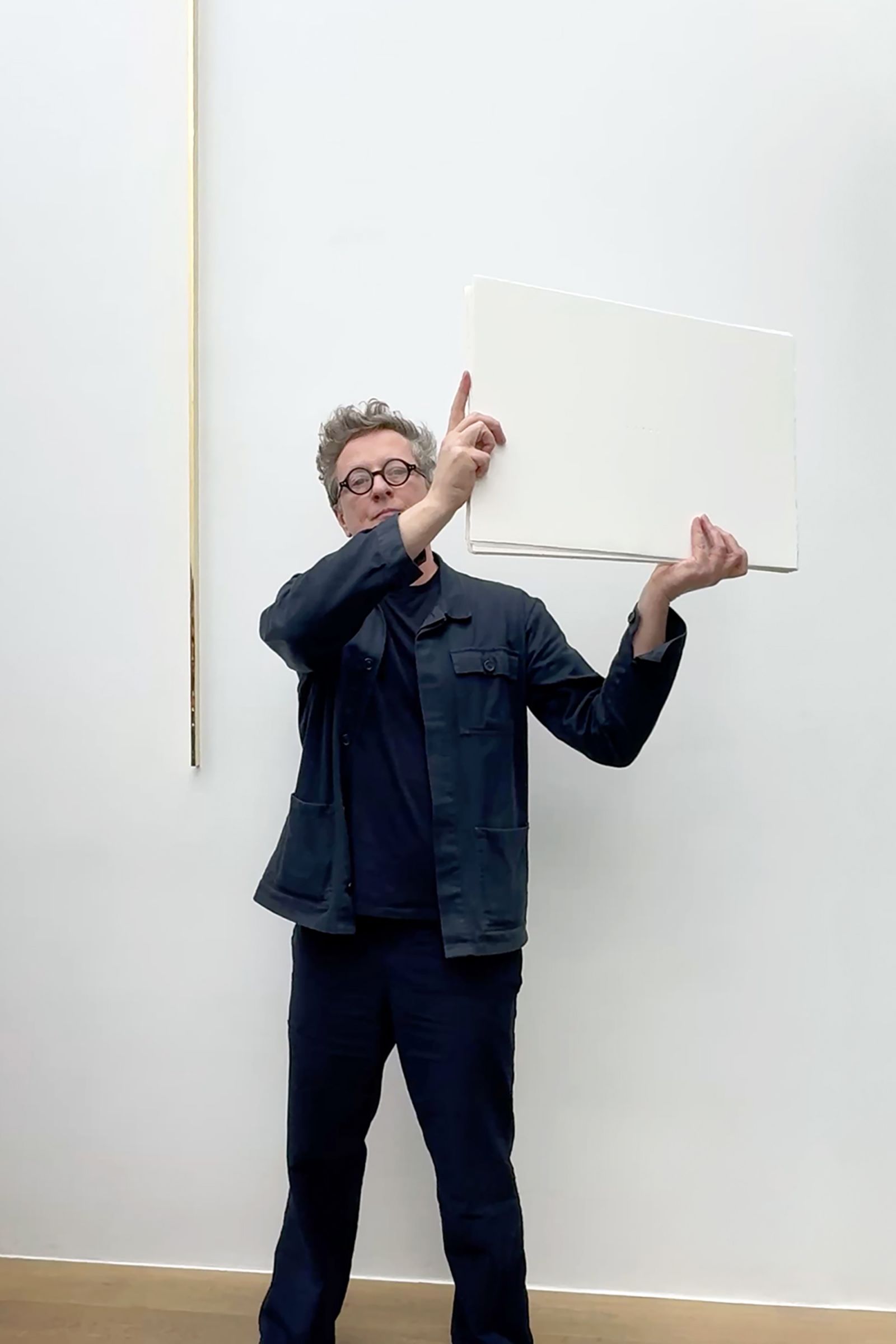 As part of his exhibition LA MARIEE IRA MAL*, Jean-François D’Or brings together Thomas Gunzig. In a twist, the writer reads a text written by the visual artist. Following this, the artist presents a performance in the form of an “almost silent” reinterpretation of Bob Dylan’s famous video for Subterranean Homesick Blues, filmed by D.A. Pennebaker in London on May 8, 1965. Unlike a sign that would assert a statement, small, barely legible to the audience, words are punched into the thickness of the papers he pours out in a hypnotic slowness. Some words are murmured, others left unspoken. The falling white sheets unfold in calm gestures. A large pile of these discreet and silent words gradually covers the ground.
